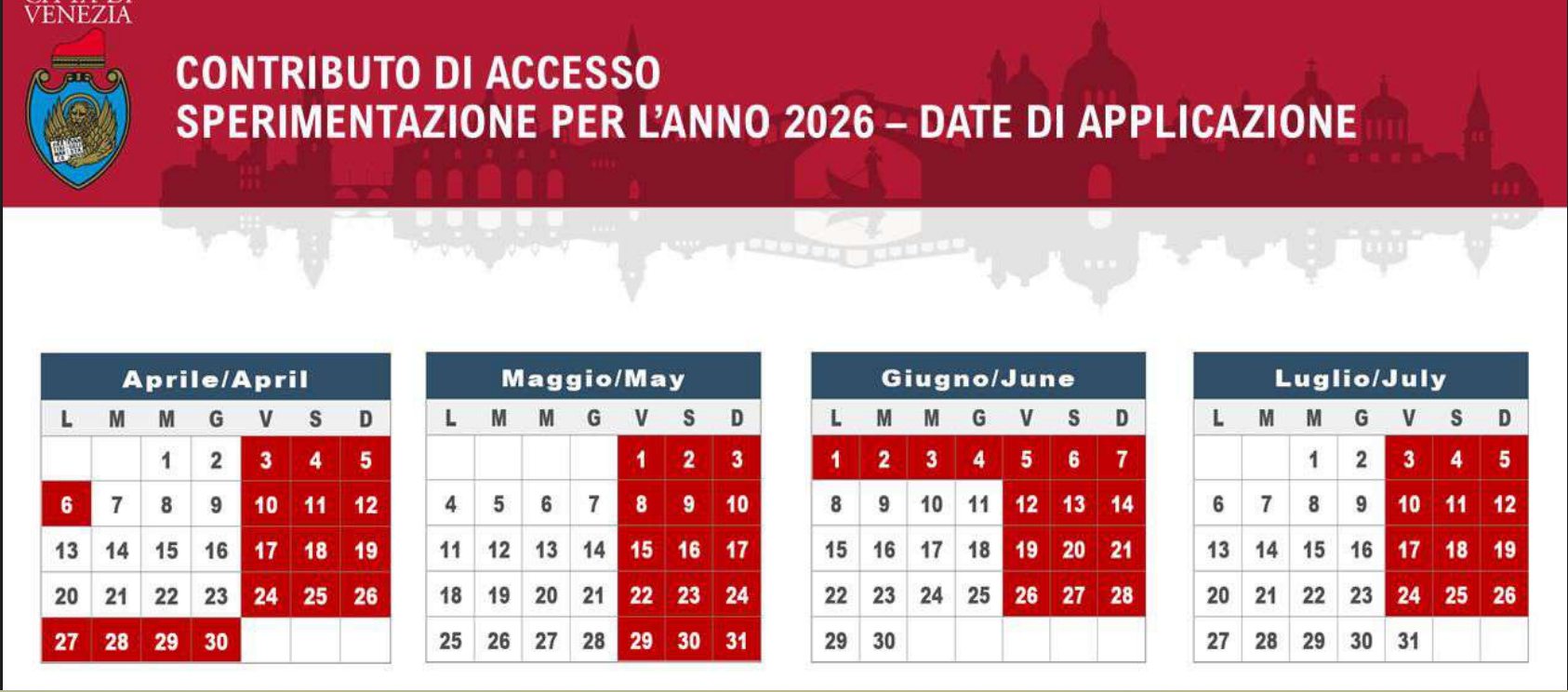 本年度は60日間が課税対象となり、4月3日から7月26日までの主に週末および連休期間に、歴史地区を訪問する日帰り観光客に対して支払いが義務付けられます。対象日には、午前8時30分から午後4時までの時間帯(※午後4時から午前8時30分までは入島税は徴収されません。)に歴史地区に滞在する15歳以上の訪問者が、事前登録および決済を行う必要があります。